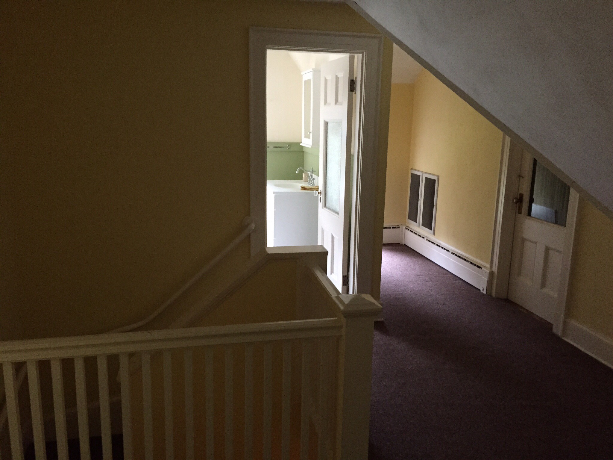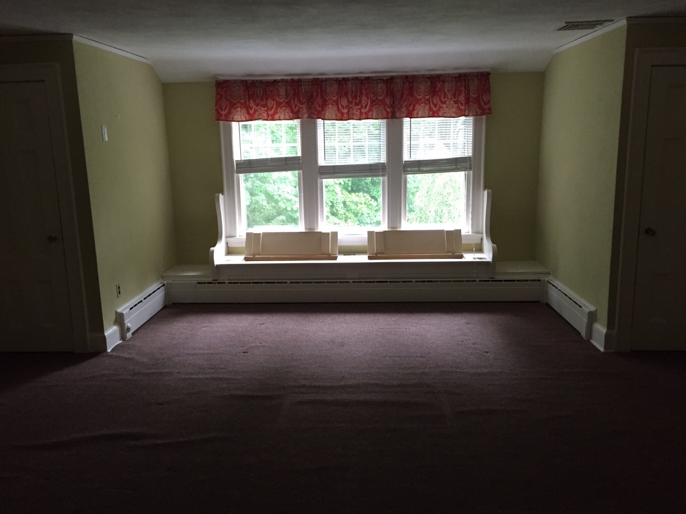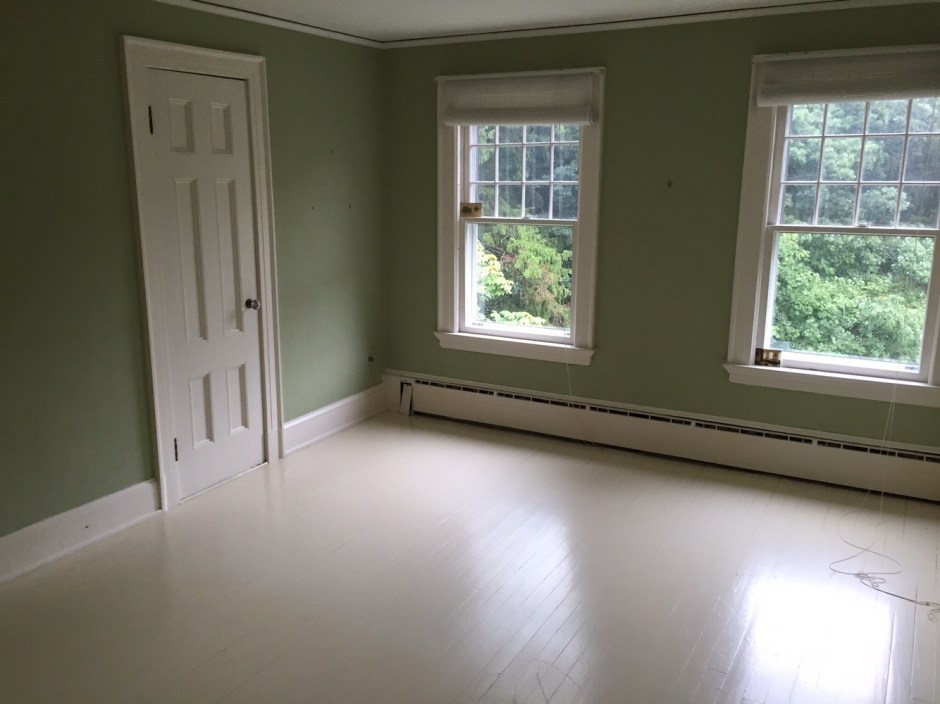 During the initial projects (floor refinishing and painting), we inhabited the attic. Reactions to this arrangement ranged from surprise to disdain- the attic? A more accurate description- finished third floor.  Complete with indoor/outdoor carpeting and a color scheme to match, three rooms and a bathroom comprise the space.